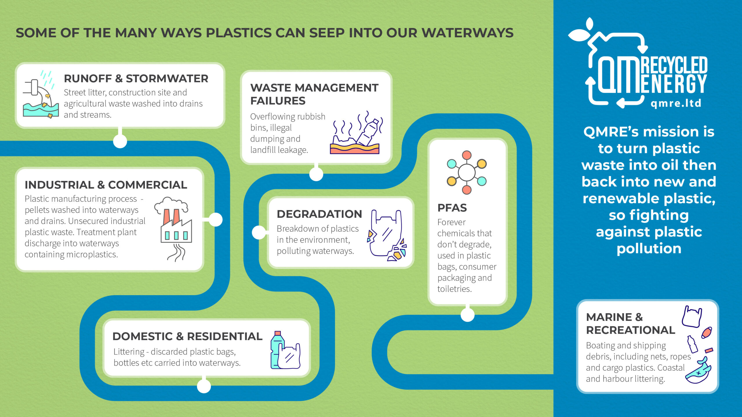 The accompanying graphic shows just some of the ways in which our waterways – and ultimately the seas and oceans – can be contaminated by waste. This graphic is part of an educational tool being sent out initially to schools in Kent (where QMRE is based) to help educate young people about the dangers of plastic waste pollution to our waterways.