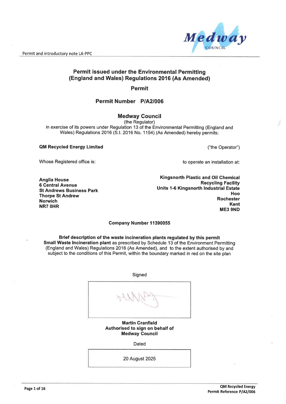 In what CEO Tim StClair-Pearce calls a ‘momentous landmark’, QM Recycled Energy (QMRE) has successfully applied for and obtained a crucially important SWIP (Small Waste Incinerator Permit), which means the plastic waste-2-oil operator can start processing plastic waste at its 25,000 square foot HQ complex at Hoo, Rochester, Kent.